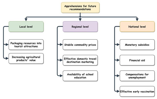 Nearly half of the interviewees provided suggestions to solve these current challenging issues. They formed a coalition to strongly request that the government provide monetary subsidies to compensate for the loss of their income during the pandemic. Other propositions included the availability of early vaccination, business compensation, the reduction of agricultural debt, and the increase of agricultural product value. The respondents’ suggestions for the future recommended discussions at local, regional, and national government levels. At the local level, since most of the residents are engaged in farming and agriculture, optimizing the existing resources around the village by enhancing the value of the agricultural products and packaging resources into tourist’ attractions are high priorities. At the regional level, the stability of commodity prices, accessibility of school education, and effective marketing for domestic travel destinations are helpful for the survival of CBT villages during the pandemic. At the national level, due to financial difficulty and threat of the COVID-19 virus, monetary subsidies, effective early vaccination, compensations for the unemployment, and financial aid are recommended to lessen the burden for CBT residents (see Figure 5).