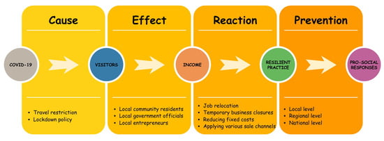 Community-based tourism in Thailand has experienced the COVID-19 crisis in ways that explicate the outlook of local business settings and social cultural factors in general. The retrospect from the interviewees were illustrated in terms of the impacts of the crisis, the adaptation actions taken, and the future recommendation for managing local operations and business activities. As a result of using the phenomenological technique, the implications of this study are presented in a framework to explain the relationships between the underlying constructs [14]. Figure 6 demonstrates the key constructs on cause, effect, reaction, and prevention-resilient practices in the study case.