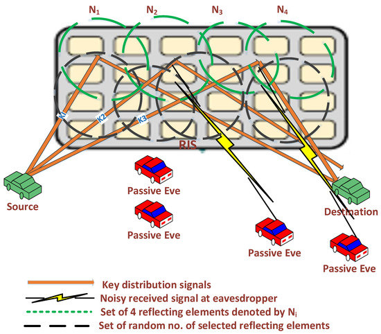 The received signal strength is represented by , where . It is assumed that during the interval , the location of the legitimate vehicles is known. Based on this, we can target the specific reflecting elements of the RIS to introduce randomness in the signal. Initially, the source and destination exchange training symbols x determine the conditions and location of the communicating vehicles, to establish the key exchange process. Thus, the received signals at the source and the destination vehicles, at a time interval , are given as