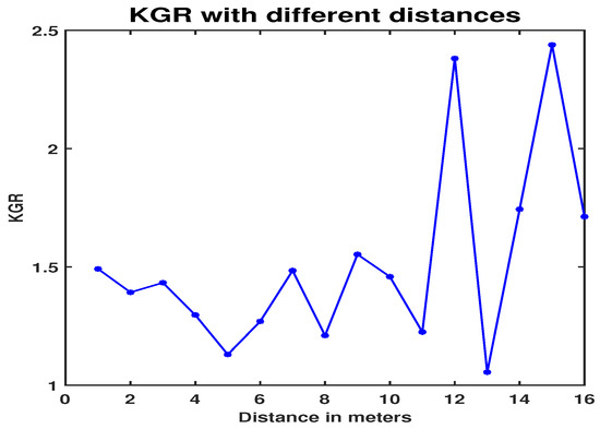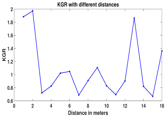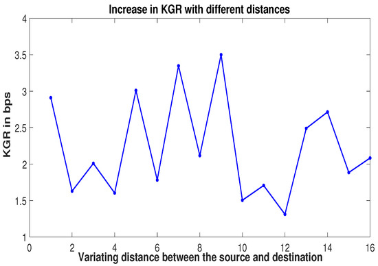 Figure 2 represents a set of 4 reflectors among 16 for an RIS. The angular distance between the source and destination is kept different, i.e., a random value between 1–16 m, and the angle of incidence is also taken as a random value between 0–2. The noise values here are kept minimum to see the effects on KGR for a constantly varying distance. It can be observed from Figure 2, the KGR constantly changes due to the fluctuation in distance between the source and destination. With a minimum noise value, the rate of key generation increases up to bps, while at the lower distances, the KGR is minimum to bps for a worst-case scenario. This is due to a number of factors. One of the major factors that result in an increase is the distance between the legitimate vehicle and the eavesdropper vehicle, i.e., the distance of the eavesdroppers both from the source and the destination. The larger the distance, the better the KGR. Similar to the distance are the noise values at the eavesdropper, which also improves the KGR at the legitimate vehicles. As the model incorporates an RIS, thus, the phase shift also plays a major role in increasing the KGR. The number of REs that are covered during the phase shift also has a significant effect on the KGR.