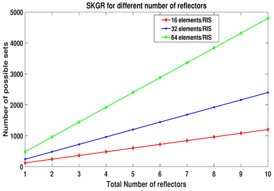 Figure 5 represents the possible subsets per RIS, of size 16, 32, and 64, respectively. Here we are considering a random number for the subset of reflectors. It can be observed from the graph that the possible subsets for an RIS-sized 64 are much higher, i.e., 5000, in comparison to that of 32- and 16-sized RISs, which are up to 2250 and 1000 subsets, respectively. Thus, large-sized RIS provides a larger variation in the number of subsets, resulting in an increased number of possible keys being generated.