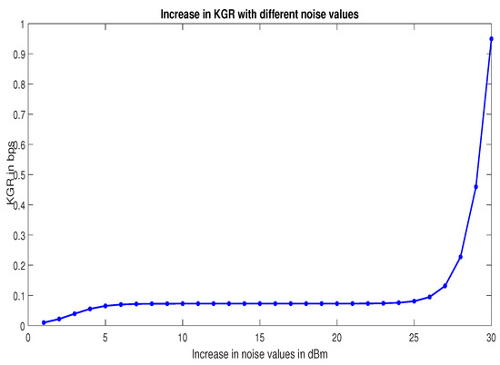 Figure 6 shows the effects of changes in noise values on the SKGR. For our previous simulations, we considered the worst-case scenarios where there was minimal noise. Here, with the increase in noise values, the SKGR starts to provide a better performance, as it reaches up to bps. Thus, from the simulation results conducted noise also has a significant impact on SKGR. An induced noise at the eavesdroppers can also significantly improve the SKGR at the communicating devices.