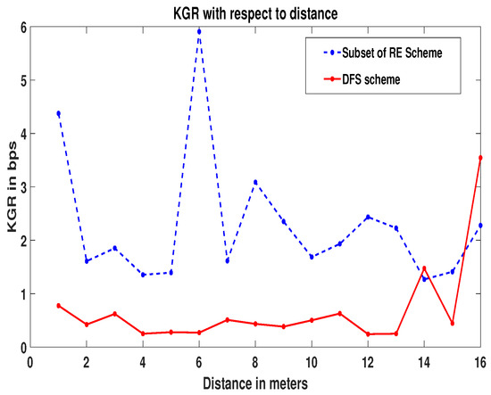 To validate our results in Figure 7, we have implemented the existing DPS of a static environment on the vehicular environment and then the results are compared with our proposed scheme. In Figure 7, a random distribution is adopted for both the legitimate as well as the eavesdropper vehicles. The DPS mechanism performs well but, as soon as the eavesdropper gets within signal-receiving range, there is a sharp decrease in the KGR per time slot.