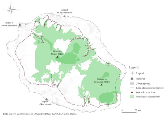 Reunion Island is an outermost territory of Europe and a French overseas department and region. The island is characterized by specific structural, territorial, and economic characteristics, as shown in Figure 1. Indeed, the territory has undergone profound changes and this situation is reinforced by a demography in full transition. The main urban centers and other economic activities have successively agglomerated on the coastal fringe, where today they maintain close relations of dependence [35,36]. Today, three-quarters of the population of Reunion Island live on the coast and the lower slopes, which corresponds to just over 630,000 people living at an altitude below 400 m. This characteristic is highlighted when we know that the island is covered up to 40% by the National Park. Waste management is particularly sensitive in Reunion, given the delay in this field and the importance of the deposits.