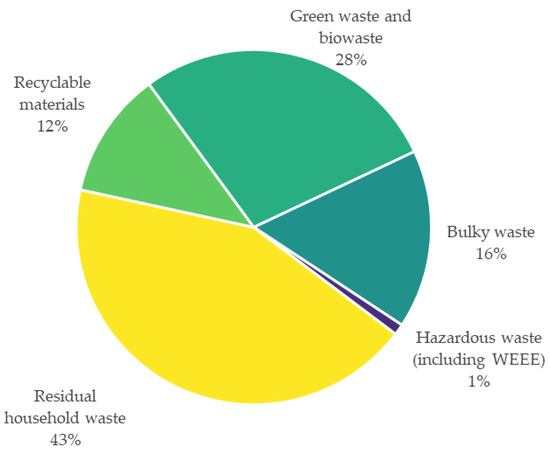 The data on residual household waste production are taken from the Public Waste Disposal Service documents [44,45,46,47,48]. In accordance with the regulations in force, namely:
