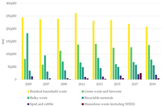 Figure 3 identifies the household and similar waste streams resulting from separate collection operations, door-to-door, or at waste collection centres. Residual household waste is the most important fraction of household waste. The average proportion of residual household waste is estimated at around 23,000 tons, over the period 2005 to 2019, with an overall decrease of around 15% over this production period. The residual household waste collection performance, per capita, for 2019 was 241 kg at the local level, compared to 247 kg at the national level.