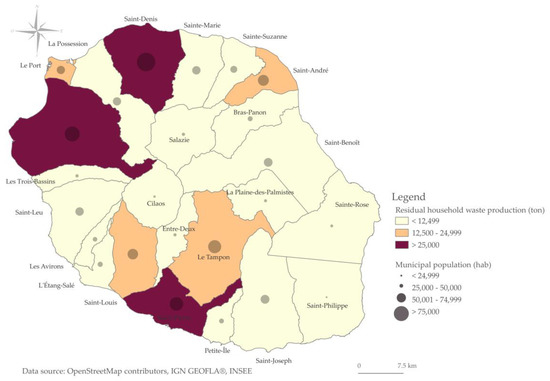 The map on Figure 4 shows the production of household waste, according to the demography at the municipal level. Saint-Denis, the capital city, has the communes of Saint-André and Sainte-Marie gravitating towards it, the latter alone accounting for 30% of the total population of Reunion. This demographic situation means that this first aggregate generated the equivalent of 68,544 tons of garbage over the same period, an average of 280 kg of garbage per capita. Incidentally, Saint-Denis is the capital of the departmental region of Reunion, whose population amounted to more than 153,000 inhabitants in the 2019 census. This demographic situation makes the commune of Saint-Denis, the most populated commune of the island. Moreover, the commune of Saint-Denis is the most important commune, in terms of production of residual household waste, with 43,265 tons generated over the reference period.