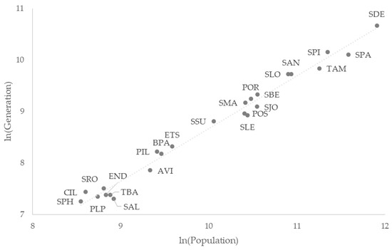 A linear regression model is tested to establish a relationship between an explained variable and an explanatory variable, i.e., the explanation of the residual household waste production of municipalities, according to the demography. The model is based on the Napierian logarithm function to make the data more normally distributed, in order to allow the modeling of the data, according to a curve pattern. The fitting of the model consists in determining a trend line that best approximates the scatterplot in the plane, noted mathematically, according to Equation (1):