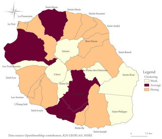 The scatter plot approach allows for the comparison of two sets of values to show the relationship between them. The linear expression in the figure shows a positive influence of the population on the development of the variable under consideration. The coefficient of determination R2 measures the goodness of fit of the regression to describe the distribution of the points. The mathematical property then provides an R2 coefficient equal to 0.98, which attests that the population allows for a more or less accurate estimation of the production of residual household waste. Production, in terms of residual household waste is underestimated. Indeed, the difference between the observed values and the estimated values, amounts to 984 tons of residual household waste. The overestimation is close to an average error of less than 1% on the production of residual household waste in Reunion, in 2015. In perspective, the map in Figure 6 shows three clusters of municipalities that share certain characteristics.