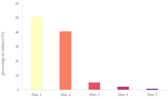 The estimation errors on the different groups considered by the linear regression model allow us to consider that demography, as an explanatory variable, consents to globally describe the production of municipal solid waste. Nevertheless, other variables can improve the understanding and therefore the formation of waste production. The principal component analysis approach addresses the behavior of the different municipalities with regard to the production of residual household waste. The eigenvalues describe the explained variance for each principal axis, as shown in Figure 7. More than 90% of the total variance is explained by the first two values, therefore the principal component analysis can be reduced to a representative projection of the variables on dimensions 1 and 2. The quality of the representation of the variables is described by the cos2 parameter. For a given variable, the cos2 parameter makes it possible to interpret the principal components under consideration. In this case, all of the variables shown by component 1 and 2 have a cos2 close to or greater than 0.80.