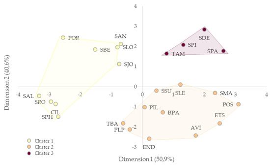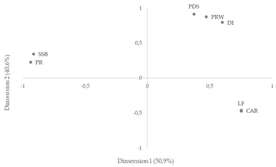 The description of dimension 1 identifies a correlation greater than 0.75 for the variables “Share of households with a car—CAR” and “Labor force participation rate of 15–64 year olds—LF“. Conversely, dimension 1 is inversely described by the variables “Poverty rate—PR” and “Share of total social benefits—SSB” with a correlation equivalent to −0.90. The description of dimension 2 identifies a correlation of 0.87 for the variable “Production of residual household waste—PRW”. The variables “Permanent database of facilities-shops—PDS” and “Disposable Income—DI” follow the variable “Production of residual household waste—PRW”. The quality of the representation of the variables is estimated at more than 0.90, with a correlation at dimension 2, higher than 0.80. In these results, the p-values for the description of the variables considered are all below the significance level of 0.05, indicating that the description coefficients are significantly associated with a given principal component.