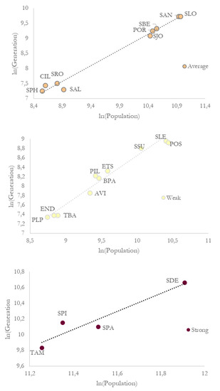 A group called, “weak”, composed of seven communes, is distinguished by a low demographic level where waste production is low. This first group is diversified in that it includes the communes of Cilaos, Entre-Deux, Salazie, Trois Bassins, La Plaine-des-Palmistes, Sainte-Rose and Saint-Philippe. The demography of this first grouping concerns 5.25% of the total population of the department of Reunion, i.e., 4.70%, in terms of residual household waste production. The “weak” group concerns the communes whose population does not exceed 10,000 inhabitants and whose waste production is around 1500 tons. The analysis of this linear regression model considers an overestimation of the waste production, i.e., a difference of 318 tons of waste, between the observed value and the estimated value. The average per capita production is estimated at 247 kg.