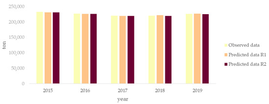 Depending on the approach, the estimates of household residual waste generation are close to the observed data. According to Table 2 and Table 3, the MAPE statistic (mean absolute percentage error) expresses the predictive quality of an estimation model as a percentage of the error. Among other things, the value proves to be a convenient indicator for comparison. The R2 regression model exhibits a lower value than the R1 regression model, i.e., 8.33%, compared to 11.81% for 2015. The specific values within the R2 regression model for the strong and medium categories are more explicit at 2.48% and 8.56%, respectively. The communes in the weak and medium weak group exhibit worse values at 10.28%. This result reflects several estimation errors partially weighted by undetermined profiles. The approach used was to predict the residual waste production data for the years 2016 to 2019. The prediction results show average estimation errors of about 1000 tons. The MAPE parameter exposes the R2 model favorably to the R1 model, i.e., 7.47 to 11.91 for the year 2016, 7.44 to 10.52 for the year 2017, 9.19 to 10.02 for the year 2018, and 5.72 to 8.58 for the year 2019, respectively. The estimation performance is better represented through the R2 regression model, compared to the R1 model.