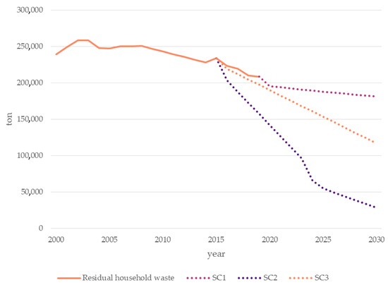 Scenario 2—SC2 shows a very proactive approach, where communities openly engage in a waste management policy. The production of residual household waste would decrease by an average of −12.87% per year over the period 2015–2024 and 13.13% over the period 2025–2030. For the year 2030, the production of residual household waste is estimated at 28,036 tons.