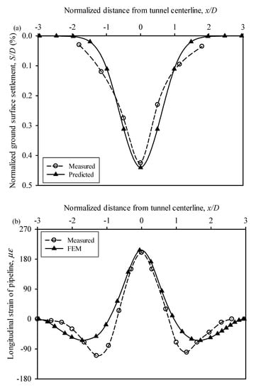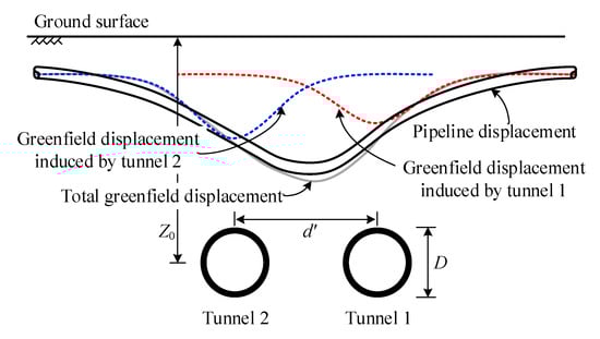 Buried pipelines are widely used in water supply and sewer collection systems. With the construction of new pipelines and the increment in existing pipeline networks, it is inevitable for buried pipelines to go across differential ground movement areas induced by tunneling [,], earthquakes [], landslides [], faulting offset [,], etc. Among these geohazard environments, tunnel excavation is one of the most frequently encountered adverse conditions for buried pipelines. Under the tunneling effects, the ground will be disturbed, and ground volume loss will occur, which can further lead to differential ground settlement. The pipelines buried above the tunnel will deform correspondingly, and even stress state beyond expectations can occur in pipelines []. Once the pipe deformation and loading state exceed the pipeline service limits, the pipes’ serviceability can be deteriorated, and structural failure of pipelines can happen [,].