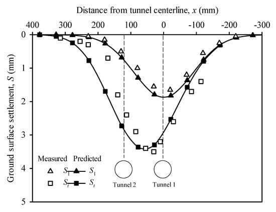 The ground settlements obtained from the test measurements [] and the modified method are depicted in Figure 2 for comparison. The tunnels had a diameter and burial depth of D = 4 m and Z0 = 15 m, respectively. The distance between tunnels is about d′ = 1.6D. The volume loss for a single tunnel is VL = 12%. The values of M and K are 0.6 and 0.3. The measured maximum settlements after the first and second tunnels are about 1.65 mm and 3.5 mm, and the corresponding predictions are 1.82 mm and 3.36 mm, respectively. It can be seen that the measured values and shape of ground settlements match the prediction quite well. The effectiveness of the modified ground settlement prediction method can be evaluated.
