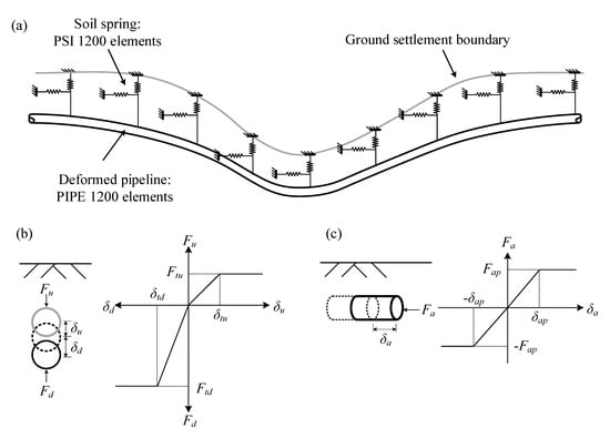 The ground settlement boundary predicted using the modified method is applied to the finite element pipe–soil–tunnel interaction model, as shown in Figure 3a. The model is established using ABAQUS 6.14. The pipeline is modeled using 1200 numbers of beam (PIPE31). The pipe–soil interaction is reflected by the compression and extension of soil springs along the pipeline, characterized by 1200 numbers of pipe–soil interaction (PSI) elements. Three directions of relative pipe–soil displacements are considered, i.e., the upward, downward, and axial directions. Thus, three different bilinear force–displacement relationships are considered in the simulation, as shown in Figure 3b,c. The soil resistances and relative displacement in the upward, downward, and axial directions are Fu, Fd, Fa and δu, δd, δa. The peak resistances and corresponding relative displacements are Ftu, Ftd, Fap and δtu, δtd, δap, respectively. The peak resistances can be estimated via Equation (7), in which Ncv and Nqv are uplift factors; Nc, Nq, and Nγ are bearing capacity factors; c is the cohesion of soil; and γ is the unit weight of soil. H and Dp are the burial depth and outer diameter of pipe, respectively, and α is the adhesion factor. K0 is the coefficient of pressure at rest, and δ is the interface friction angle for pipe and soil. The corresponding displacements can refer to ALA standard []. The values of Ncv, Nqv, Nc, Nq, and Nγ can also be obtained based on ALA standard [].