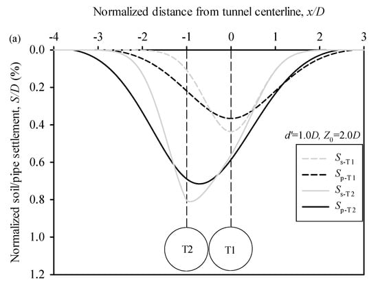 Two tunnel burial depths and three twin-tunnel spaces are considered in this section, i.e., Z0 = 2.0D and 4.0D, d′ = 1.0D, 1.5D, and 2.0D (Table 2). The other dimensions and material properties of pipeline, soil, and tunnels are the same as in the previous section. The results of ground/pipeline settlement and pipeline bending strain are depicted in Figure 5, Figure 6, Figure 7 and Figure 8.