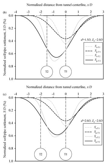 It can be seen from Figure 5 that under the tunnel depth of Z0 = 2.0D, the maximum ground settlement is relatively larger than that of buried pipelines after the tunneling, but the width of the pipe settlement trough is remarkably larger than that of the ground settlement. With the decrease in twin-tunnel space from d′ = 1.0D to d′ = 2.0D, the maximum pipe settlement after the second tunneling Sp-t2 decreases correspondingly from S/D = 0.72% to 0.59%. The maximum Sp-t2 locates directly above the second tunnel when d′ = 1.0D, and the position moves gradually to the midspan between the two tunnels when d′ = 2.0D.