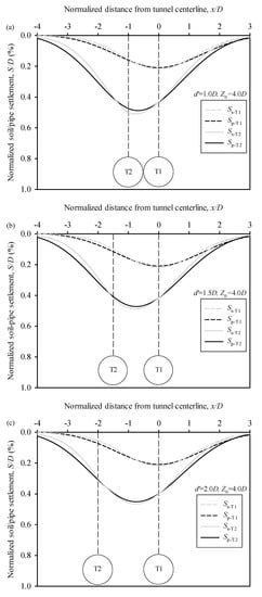 Chapman et al. [] proposed a modified ground settlement prediction method, and evaluated the results against small-scale model tests. The expression for modification function F is given in Equation (4), which illustrates the enlargement of ground settlement caused by the second tunneling compared to the first one. M is the maximum modification coefficient, which represents the maximum percentage of settlement increment above the first tunnel, while d′ is tunnel space, Z0 is tunnel depth, and A is the multiple of trough width in half a settlement trough []. Once F is obtained, the modified settlement trough induced by tunnel 2, S2-mod, can be estimated using Equation (5), where S2 is the settlement above tunnel 2 before modification, and can be estimated using the same method for the settlement caused by tunnel 1, i.e., S1. Then, the total settlement St can be obtained based on Equation (6).