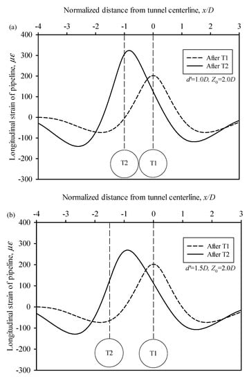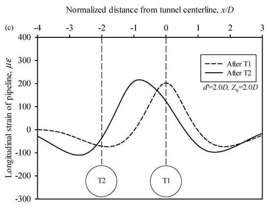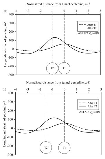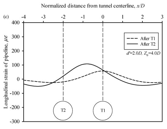 The numerical results of longitudinal pipe strain after the tunneling process are shown in Figure 7 and Figure 8. It can be seen that under a relatively shallow tunnel depth, the response of buried pipeline changes significantly during the variation in the tunnel space. Under the condition of Z0 = 2.0D and d′ = 1.0D, the maximum pipe strain increases remarkably from 202 με to 324 με when the second tunnel is constructed, and the position of the peak strain moves from the top of tunnel 1 to the top of tunnel 2. With the increment in tunnel space from d′ = 1.0D to 2.0D, the peak pipe strain after the second tunneling decreases gradually to 216 με, and the peak strain occurs at the midspan of the two tunnels. When the tunnel depth is increased to Z0 = 4.0D, the variation in tunnel space does not seem to have obvious effects on the longitudinal pipe strain results. Under the studied tunnel space conditions, the pipe strain only slightly changes between 134 με and 108 με.