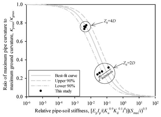 in which b is the biased distance of the maximum settlement position, i is the distance to the inflection point, and Smax is the maximum settlement after the second tunneling. The value of Smax and the ground settlements can be estimated using the method introduced in the previous section. Then, the values of b and i can be obtained by curve-fitting. The results are plotted in Figure 9 for comparison. The pipe and ground curvatures are obtained from the finite element analysis. Ku and Kd represent the ratio between peak soil resistance and the corresponding relative pipe–soil displacement, details of which can be found in Wang et al. []. It can be seen that when the tunnel depth is relatively large, i.e., Z0 = 4D, the obtained results match quite well with the best-fitting curve provided by Wang et al. [], and the change in twin-tunnel space does not affect the results significantly. When the tunnel depth is relatively small, i.e., Z0 = 2D, with the increase in tunnel space, the dimensionless pipe–soil response result generally moves to the left, indicating that the existing best-fitting curve becomes relatively conservative when it is used to predict the pipeline performance under twin-tunneling conditions.