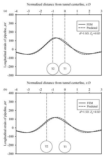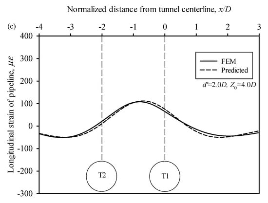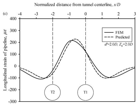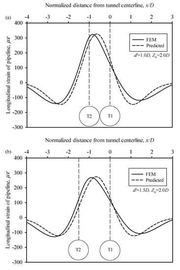 in which D is the tunnel diameter. The predicted results are shown in Figure 10 and Figure 11. For comparison, the numerical results from the beam-on-spring modeling introduced in the previous section are also provided. It can be seen that after the modification, the predicted results match quite well with the numerical results, especially under relatively large tunnel burial depth conditions. Moreover, when the twin-tunnel space increases, both predicted and numerical results of peak pipe strain decrease correspondingly. For instance, when d′ = 1.0D and Z0 = 2.0D, the predicted and simulated peak pipe strains are 327 and 324 με, and they occur at about −0.64D and −0.84D, respectively, to Tunnel 1. When d′ increases to 2.0D, the peak pipe strains are 228 and 216 με, and occur at −0.68D and −0.80D, respectively, to Tunnel 1 (see Figure 10). Under the condition of Z0 = 2.0D, the values and positions of peak pipe strain from both methods are even closer to each other. When d′ = 1.0D, the peak pipe strains are 131 and 134 με, they locate at −0.63D and −0.79D to Tunnel 1. When d′ = 2.0D, the corresponding results are 112 and 108 με, −0.70D and −0.79D, respectively, for prediction and numerical simulation, as shown in Figure 11.