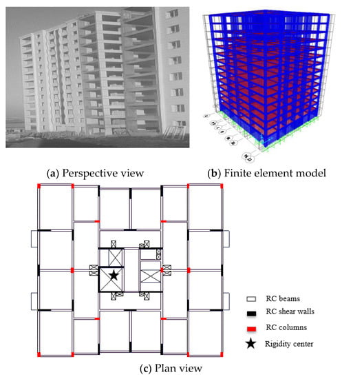 An RC building with shear walls was designed asymmetrically which led to long distance between mass and rigidity centers has been analyzed to investigate its seismic performance under the effects of strong ground motions. The building has 14 stories including basement and one-story penthouse as seen in Figure 2. The slabs are flat with RC beams and the building is 49 m in height. The RC structural system is a frame system of columns and shear walls (Figure 2c). This building was constructed with a torsional irregularity due to pure engineering design. The building has 15 columns, 6 long shear walls and 18 short shear walls. The five of the long shear walls (>3 m) were placed in x-direction. To balance allocation of the shear walls in both directions, 12 short shear walls (<2 m) were placed in y direction, the rest were in x direction. The total length of the shear walls is 37 m in x and 30 m y direction. On the other hand, if the inertia moment is considered, the building is far from having equivalent rigidity in both directions. Therefore, this design approach has caused serious structural issues like torsional problem. Asymmetric rigidity of the shear wall system has deteriorated the torsional stability and furthermore shear walls were generally concentrated in the plan center of the building. Although the sectional areas of shear walls are almost the same in both directions (6.94 m2 area in x direction, 6.34 m2 area in y direction), the total inertia moments of shear walls are Iy = 4.96 m4 and Ix = 2.96 m4, where x and y are global axes. However, the shear walls should have been positioned in the outer of the building to prevent the torsional issues. This building was constructed in 2018 and many existing structures may have the same torsional instability problem.