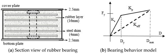 In Table 1, Kd, Keff and Kv are the post-yield, the effective and the vertical stiffness, respectively (Equations (1)–(3)). A is the rubber area and G is the shear modulus of rubber. Q is the characteristic strength and Dy is the yielding displacement. Fmax and Dmax are peak force and displacement in the isolation device, respectively. Rubber material can deform up to 400–500% and rubber bearings may be analyzed with the maximum shear-strain levels of 150% []. To limit the shear displacement of a bearing, the maximum displacement capacity (δs,) is defined [,],