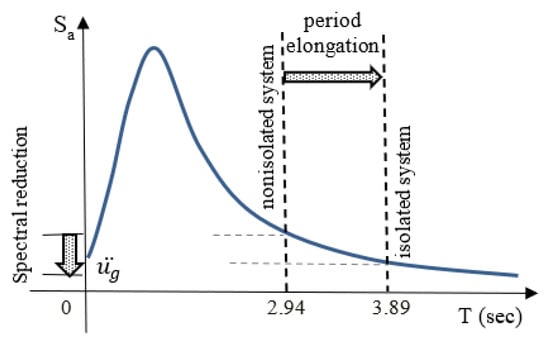 where, Teff is the effective period of the building, Sa1 is the design spectral response factor at T = 1 s, g is the gravity acceleration, BM is the damping coefficient (BM = 1.35 for 14.8% effective viscous damping). Using this approach, the design displacement of the bearing is 0.428 m including torsional effects. Another restriction for maximum bearing displacement is also presented by 0.7 times of maximum shear strain value []. Additionally, a different shear displacement (δs) restriction is Tr ≥ 2 × δs []. Bilinear behavior model is adopted for LRB devices in the inelastic analyses. As it is known, the seismic bearings seriously increase the free vibration periods of a structural system. While the fundamental period (T1) is 2.94 s for non-isolated building, this value has increased to T1 = 3.89 s for the isolated building. The vibration periods are comparatively presented in Table 2. Furthermore, the effect of rubber bearings is showed on an acceleration spectrum as seen in Figure 4. With increasing period values, lower spectral coefficients have appeared for the isolated building.