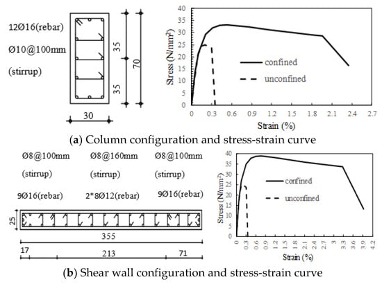 All reinforced concrete columns and shear walls have different sizes where their heights are equal to 3 m. The Mander’s model [] has been used to calculate mechanical properties of confined concrete. The stress-strain curves of a sample column and shear wall sections are given for confined and unconfined concrete in Figure 5. The flexural and shear reinforcements are shown in Figure 6 for a center column. The ultimate failure (spalling) strain for the concrete cover, εcs, is considered as 0.0035 and the ultimate strain capacity of steel, εsu, is defined as 0.08 with yielding strain (εsy) of 0.0021. The strain hardening value, εsh, is considered by 0.011. According to the analysis, it is worth nothing to declare that crushing strain limit of the concrete is impotent in the structural response of the members. In RC members, the steel confinement enables high restriction in lateral deformations, and it provides a significant increase in ductility []. Thus, the ultimate strains, plastic rotations and core concrete strength capacities have been increased. Lateral confinement effect both in terms of ductility and strength provided by stirrups has been shown in Figure 5a,b.