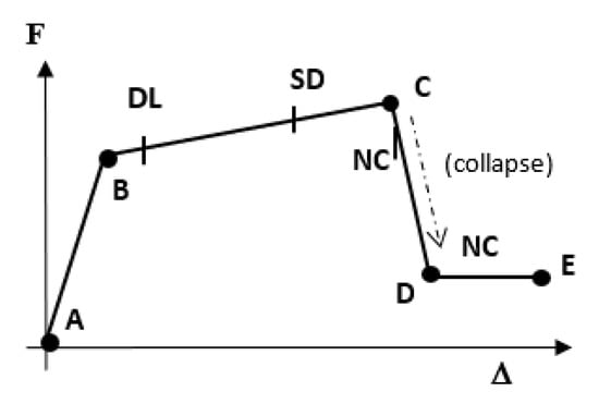 Nonlinear static method (pushover) is an approximate procedure, and it uses iterative calculations and estimations to capture real inelastic behavior. The performance assessments related with pushover analysis are implemented by the capacity spectrum procedure [], the displacement coefficient procedure [] and the equivalent linearization technique []. Additionally, there are improved procedures known as modal pushover analysis was introduced to overcome deficiencies []. Furthermore, research by Aydinoglu 2003 [] has been presented to improve the accuracy of the results by using incremental modal analysis. Although standard plastic hinge models are defined by many codes ([,,]), a user-defined plastic hinge model (P-M2-M3) is used in the analyses as given in Figure 7. The hinge parameters are determined on the basis of sectional analysis and these values are given in idealized form in Table 4. A software package [] is used for obtaining the performance of the building system. Three performance limits have been assigned for structural members: damage limitation (DL), significant damage (SD) and near collapse (NC).