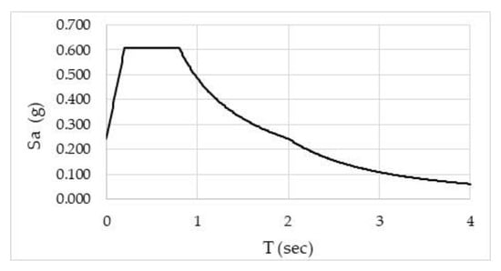 Elastic design spectrum is assigned by site-spectral coefficients suggested by earthquake hazard maps. Peak spectral value is found as PGA = 0.27 g (peak ground acceleration), from seismic maps [] for the building site. Local soil property of the seismic zone is considered as ZD (predominantly soft-to-firm cohesive soil) (Vs30 = 180 m/s). Influence coefficients of local soil are Fs = 1.25 and F1 = 1.5. The building position to the active fault zone is more than 25 km and near-fault effects are neglected. Design spectrum is obtained on the basis of EC8-code [] with 5% damping and the spectrum is given in Figure 8.