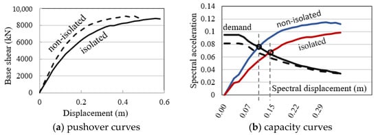 The value of effective damping, βeff, is 0.096 of critical damping and the reduction factors have been obtained as SFA = 0.789 and SFV = 0.838. For lateral capacity, the building system is pushed by applying gradually increasing forces in horizontal direction. Pushover curves of the building are obtained and comparatively presented with capacity curves in Figure 9 in terms of base isolation effect. Target response values are determined by considering Eurocode design earthquake. As known, pushover curves describe the relationship between base forces against roof displacements. Thus, those curves provide valuable information about structural performance. Thereby, the performance targets can be defined with the corresponding forces and displacements by courtesy of pushover curve. Performance point (P) corresponds the intersection of structural capacity and reduced demand spectrum.
