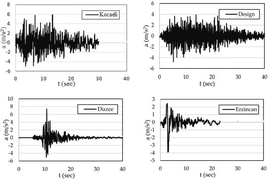 For obtaining the time-dependent deformations and inelastic responses, time history solutions have been implemented under generated and recorded strong earthquakes of Düzce 1999 and Kocaeli 1999, Erzincan 1992 earthquakes []. Furthermore, another simulated record has been generated compatible with EC8 design spectrum. The generated accelerations are illustrated in Figure 10.