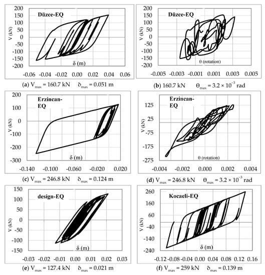 For earthquake loadings, hysteretic behaviors indicate the energy consumption capacity absorbed by a structural member. In Figure 11, the hysteretic responses of the bearings are presented in terms of lateral displacements (δ) and rotations (θ) under effects of the earthquakes. Among the considered earthquakes, the peak hysteretic responses are obtained from Kocaeli earthquake for shear force (Vmax = 259.0 kN) and displacement value (δmax = 0.139 m). The maximum bearing displacement has occurred in the first floor and this peak displacement value (δmax = 0.139 m) is lower than design displacement o(0.168 m) of the bearing. As the intensity of the earthquake decreases, behaviors close to linear are observed as seen in the design earthquake. On the other hand, plastic rotations occur on a wide scattering zone under effects of ground motions. In the strong quakes, a wider distribution has occurred in the hysteretic curves that indicating nonlinear behavior and higher damping.
