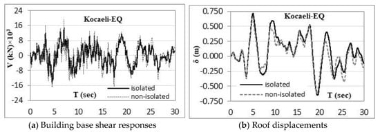 The isolated building is also investigated in terms of seismic base responses and roof displacements as seen in Figure 12. The decreases in the seismic base forces have appeared more distinctly in the early stages of the ground motion. From the response variations, the isolation system has effectively reduced the total base shear forces from Vmax = 10,919 kN to Vmax = 7971 kN for Erzincan earthquake and Vmax = 19,171 kN to Vmax = 14,694 kN for Kocaeli earthquake. Significant reductions in lateral seismic responses have developed approximately 39% (Design quake), 30% (Erzincan) and 23% (Kocaeli). On the hand, the roof displacements have increased as it is expected due to more flexible superstructure. As an example, the increase in the roof displacements is about 9%.