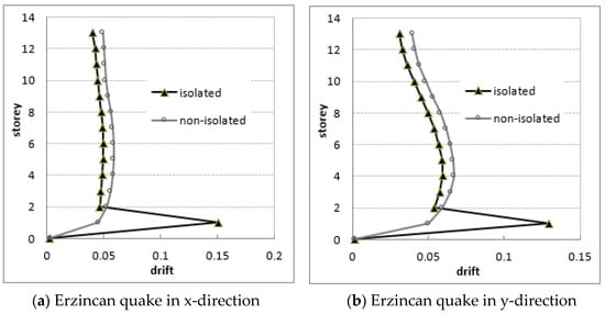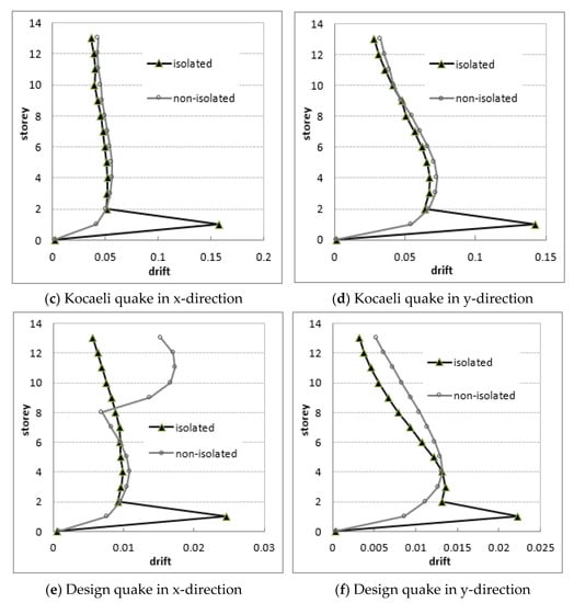 From a general point of view, the base isolation system has effectively prevented undesirable relative large displacements. Since the isolation devices have been mounted on 1st floor, large relative displacements are expected on this floor due to LRB deformations. But in direction of x, where more stiffer frames, the LRB effects have appeared differently depending on the severity of the earthquake as well. For strong quakes, while lower displacement demands have occurred on the middle floors of the isolated building, higher relative displacements have resulted in on the top floors in case of more structural stiffness. For moderate quakes, the isolation system has increased the relative displacements on the middle floors and decreased forcefully the displacements in the top floors. The results showed that the usage of the isolation system has seriously caused to different changes in the seismic responses. Decreases in the relative displacements show that the building has gained improvements to meet earthquake demands. In Figure 13, it has also proven that how the values of relative displacements of the floors are decreased by means of the isolation system.