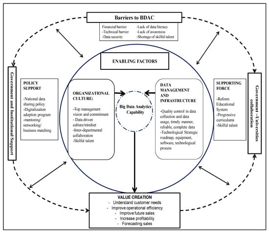 In summary, the above discussions of the themes for the enablers/importance of BDA, challenges for BDA adoption, the role of government and institutional supports are integrated to develop a BDA Capability Model that able to create value for SMEs. The model is discussed in the following section.