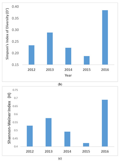 The health of the ecosystem has been evaluated with Simpson Index of Dominance (D), Diversity (D’), Shannon–Weiner Index and depicted in Figure 2.