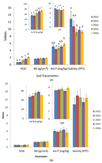 The soil parameters (pH, OC, Av N, Av P, and salinity) showed a significant variation between the years (2012-2016) as per the one-way ANOVA test (Figure 3a,b). As the main hypothesis of this study was to understand the changes in soil ecological function and service parameters due to plantation, 0-10 cm soil depth has been considered. Fang et al. 2021 [33], have opined that litter impacts mostly the top 10 cm of the soil depth. In this study, we were evaluating the temporal variation in blue carbon dynamics of a site where plantation occurred only in 2012, so it can influence only the top layer (0-10 cm) of sediment till 2017. In case of patch dominated by P. coarctata, the grass rhizoids rarely penetrate beyond a 10 cm depth and can only influence the topsoil depth (0-10 cm). Hence, in both sites, 0-10 cm soil depth has been taken for temporal variation analysis. Only bulk density showed an insignificant variation between the years. The plantation program, hence, has resulted in the alteration of basic parameters of soil. The pH range in the alkaline section has been a common case in saline mangrove soil. There has been a rise in Organic carbon between 2012 and 2016. The A. marina growing in the plot have resulted in litter fall which may have contributed to the trends of rising OC. Research on Avicennia plantations from other mangrove areas does indicate a rise in soil OC due to the intervention [34,35]. The surface soil turned dark in color due to deposition of organic matter that constitute a major portion of the Organic carbon pool in the soil.