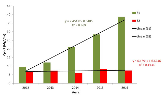One of the key ecosystem services of a restored mangrove ecosystem is the sequestration of blue carbon [4,42]. Hence, blue carbon sequestration is calculated as carbon pool in both the naturally P. coarctata dominated ecosystem (Site 2) and the plantation site for A. marina monoculture (Site 1) (Figure 5). It has been observed that Site-1 showed a steady yet significant linear increase in soil carbon pool (R2 = 0.96) while in Site-2, there has been a negligible, insignificant variation in C-pool (R2 = 0.1) between the years. Though it has been documented in the previous study that saline grassland ecosystems are productive and sequester carbon, it is negligible in comparison with an evergreen tree species, tolerant to abiotic stress such as salinity fluctuations. A. marina grows well in the Sundarban mudflat due to its wide range of tolerance to salinity fluctuations and dominating central part of Indian Sundarbans [1]. Whereas P coarctata’s ecological strategy has been to maximize spread over the mudflat through vegetative reproduction, characteristic of Poaceae family and short life cycle (seasonal or annual), with high seed dormancy, and resilience. This resulted in more random events in the P. coarctata-dominated community influenced by changes in abiotic parameters, unlike well-established A. marina monoculture. Research across the globe also supports the observation that restoration initiatives have been more likely to improve the ‘ecological functions’ of a mangrove ecosystem compared to the naturally degraded forest [43,44,45]. Blue carbon deposition in the soil can be from the input of organic matter from above-ground vegetation or brought by tidal waters or through carbon burial [46,47]. Therefore, carbon may have increased in the ecosystem through any of the processes and may not have been only because of increased litter addition. However, it can be opined that restoration initiatives may have increased the carbon entrapment in the rhizospheric sediment in the restored ecosystem.