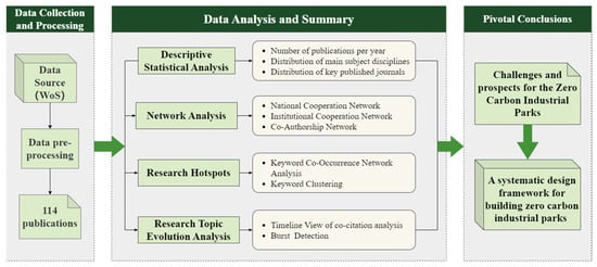 The structure of this article is as follows, as shown in Figure 1. Section 2 describes the methodology used in this research for selecting the database and the keywords, including the methods of bibliometric analysis. Section 3 demonstrates the results of the scientific mapping, including the following work: (1) descriptive statistical analysis, covering the annual number of publications, and the distribution of high-output journals and subject areas, aiming to paint a panoramic view of the field; (2) network analysis, incorporating national cooperation networks, institutional cooperation networks, and author cooperation networks, aiming to analyze the cooperation links between them; (3) research hotspots, employing keyword co-occurrence network analysis and keyword clustering to analyze the current research hotspots of carbon emission reduction in industrial parks; (4) timeline co-citation and burst detection analysis, dividing the research themes into three stages from the time dimension, then analyzing the evolution of research frontiers and summarizing the critical literature. Section 4 presents the challenges and prospects for the construction of zero-carbon industrial parks. Section 5 proposes a systematic design framework for carbon neutralization in industrial parks. Finally, Section 6 concludes the contributions and limitations of this paper.