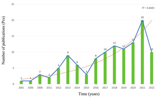 Analyzing the annual variation number of publications within a selected research domain enables the assessment of the current status of research in the field and the prediction of future trends [27]. As seen in Figure 2, the number of articles published in the area of carbon emission reductions in industrial parks increased exponentially over the past two decades, implying that the field is in a rapid development phase and that new theories and technologies are emerging [28]. In the period spanning 2001 to 2008, fewer than 10 articles were published on carbon emissions reduction in industrial parks, indicating that the significance of achieving carbon emissions reduction at the industrial park level had yet to be taken seriously during this period. From 2011 to 2013, a relatively increasing rate of publications occurred in this area. Then, there was a decline between 2013 and 2015. From 2016 to 2018, the number of publications increased moderately. However, from 2019 onwards, the number of papers increased swiftly. In 2021, the number of publications reached 20 for the first time. By November 2022, the number of publications in this field reached 10 in the year 2022. The exponential line of the publications of recent years, whose R-squared value is 0.6603, represented its reliability. The closer the R-squared value is to 1, the better the fit of the exponential line to the figures. In summary, the development of the field related to carbon emissions reduction in IPs is accelerating.