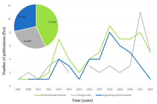 Articles related to carbon emission reduction in industrial parks are distributed among 30 subject categories in WoS. More than half of the articles were published in “Environmental Sciences” (63, 55.26%), followed by “Energy Fuels” (42, 36.84%), “Engineering Environmental” (42, 36.84%), “Green Sustainable Science Technology” (41, 35.97%), “Engineering Chemical” (15, 13.16%). Figure 3 lists the top three most published subject categories and shows the change in the number of articles published annually under each category. The number of articles published in the “Energy Fuels” category has increased steadily since 2001 and expanded explosively in 2021. The category “Engineering Environmental” experienced consistent growth in the number of articles since 2008 but encountered a decline from 2018 onwards. Finally, the “Economics” and “Multidisciplinary Sciences” categories represented a handful of novel articles published from 2013 to 2021, signifying promising directions for futural research, with themes focused on IE, sustainable development (SD), circular economy (CE), etc.