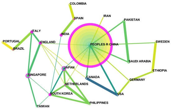 Based on the national cooperation network in Figure 4, there was relatively intimate cooperation between countries on carbon emissions reduction in industrial parks. There were 29 nodes in the collaborative network and 35 links with a network density of 0.0862. The node’s size reflected the number of articles published by the country. The larger the node, the more articles are published by that country. The top five countries and regions in terms of the number of papers published were China (65), Japan (11), the USA (10), South Korea (7), and Taiwan (7), which the size of the nodes visualize, indicating that China is dominant in terms of the number of publications. Centrality denotes the value of the country in the research field. The higher the centrality, the greater the country’s contribution to the research field. The nodes marked by pink circles have a centrality exceeding 0.1 and constitute the more critical nodes. In this study, China had the highest centrality at 0.59, followed by Korea (0.34), the UK (0.28), India (0.2), and Italy (0.2). The links between the nodes indicated the existence of a partnership between the two countries, with warmer colors signaling a more recent collaboration and cooler colors showing an earlier association. The graph shows that Canada and the USA were the first to establish partnerships, Korea and Japan, Singapore and the UK, and Pakistan and Saudi Arabia also collaborated at an earlier stage. In recent years, China has partnered with Iran, Sweden, Japan, Pakistan, Saudi Arabia, Germany, the USA, and Canada. Portugal, Colombia and Sweden, Ethiopia, and other countries have also developed cooperation with other countries recently, and various countries are proactively participating in this field of research.