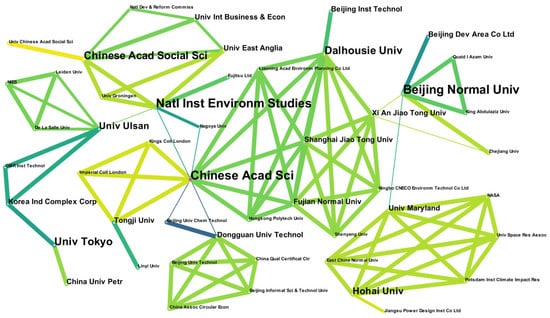 From the cooperative network of institutions, Figure 5 shows a total of 165 nodes with 214 connections, with a network density of 0.0158, which is a high value and represents a solid aggregation of the overall network formation. Tsinghua University was the most published institution with 14 articles, followed by Beijing Normal University (5), the Chinese Academy of Sciences (5), National Institute for Environmental Studies (5), and Chinese Academy of Social Sciences (4). Dalhousie University, North China Electric Power University, Texas A&M University in Qatar, and the University of Tokyo also achieved some progress in the realm of carbon emissions reduction in industrial parks. Concerning partnerships, the Chinese Academy of Sciences, National Institute for Environmental Studies, Dalhousie University, and Shanghai Jiao Tong University proactively foster interinstitutional coordination. From the point of view of the period of cooperation, Beijing Normal University, Dalhousie University, and the University of Ulsan and other research institutions established collaboration at an earlier stage, while the Chinese Academy of Sciences, Chinese Academy of Social Sciences, Hohai University, and The University of Maryland have developed many new partnerships in more recent years. From the perspective of centrality, the Chinese Academy of Sciences (0.11), National Institute for Environmental Studies (0.08), Xi An Jiao Tong University (0.06), and Beijing Normal University (0.06) were comparatively more central, and these institutions became critical nodes in the cooperative network. These institutions are vital bridges in this collaborative network.