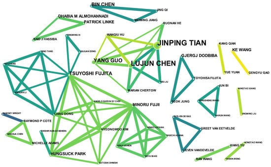 According to Figure 6, a collaborative network of scholars was generated with a density of 0.0124, 268 nodes, and 445 links. Overall, the density of these collaborative networks is relatively high, and many scholars established substantial collaborative networks. Jinping Tian from Tsinghua University (Beijing, China) constituted a significant cluster of authors. He has published 12 papers in this field. His research topics have included the construction of GHG emission inventories in eco-industrial parks, the analysis of the eco-efficiency of cogeneration in industrial parks, the impact of energy infrastructure configuration on GHG emissions in industrial parks, etc. He has analyzed the characteristics of GHG emissions by different energy-consuming facilities in industrial parks and received many citations. His partnership with Lujun Chen, the second-most published author, was initiated earlier. The two authors have recently collaborated with Yang Guo, the third most published author. In addition, a large group of authors formed around Tsuyoshi Fujita (National Institute for Environmental Studies, Tsukuba, Japan), whose research focused on assessing the carbon footprint of industrial parks, the impact of industrial symbiosis on CO2 reduction in industrial parks, and the analysis of carbon emissions and economic benefits of industrial parks and urban symbiotic networks. Together with Minoru Fujii (Center for Social and Environmental Systems Research, National Institute for Environmental Studies (NIES), Tsukuba City, Japan), Liang Dong (Institute of Environmental Studies (CML), Leiden University, The Netherlands), Hungsuck Park (Department of Civil and Environmental Engineering, University of Ulsan, Ulsan, Republic of Korea), Tsuyoshi Fujita and his associated group constituted the largest group of authors in the field.