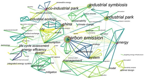 Keywords are a high-profile distillation of subject matter in the literature. They can be used to investigate hot topics and vital research issues in a given subject area based on high-frequency keywords. In CiteSpace, we set the network node types to “Keyword”, then chose pruning options “Pathfinder” and “Pruning the merged network” to obtain the keyword co-occurrence network and perform synonym merger and node adjustment. The bigger the node in the network, the higher the frequency of its occurrence. High-frequency keywords represented research hotspots in the field. As some keywords were used to retrieve the literature presented in this paper, these high-frequency keywords were removed, as shown in Figure 7. Table 3 illustrates the top 20 high-frequency keywords in the keyword co-occurrence network. The top five high-frequency keywords for studies on carbon emissions reduction in industrial parks are China, energy, system, management, and design. The analysis of these high-frequency keywords revealed that many studies on carbon emissions reduction in industrial parks use industrial parks in China as a case study, and that their authors were usually from China, which indicated that Chinese academics attach high priority to research on carbon emissions reduction in industrial parks and are in the leading position globally. A series of innovative approaches have been developed to evaluate the carbon footprint of industrial parks in China, such as a life-cycle approach, a framework for tracking carbon metabolic processes based on ecological network analysis, and an eco-efficiency assessment of cogeneration in industrial parks. Furthermore, research on carbon emissions reduction in industrial parks focused on energy consumption (coal combustion, microgrid planning, natural gas, etc.), the systematic management of park elements (management and strategic systems, CO2 integration solutions, integrated energy systems, etc.), IP system design and planning (design of low-cost integrated carbon network systems, design of integrated projects within parks, park layout design, etc.).