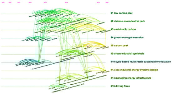 Vertically, the connecting lines between the different clustered themes represent their intrinsic links. The two earlier clustering themes, number 4, greenhouse gas emission, and number 10, cycle-based multicriteria sustainability evaluation, are strongly linked to number 1, low-carbon Pilot, number 2, Chinese eco-industrial park, and number 3, sustainable carbon, suggesting a deep connection between these five clusters. Number 14, managing energy infrastructure, is more connected to the first three clustering themes and less to the other clustering themes.